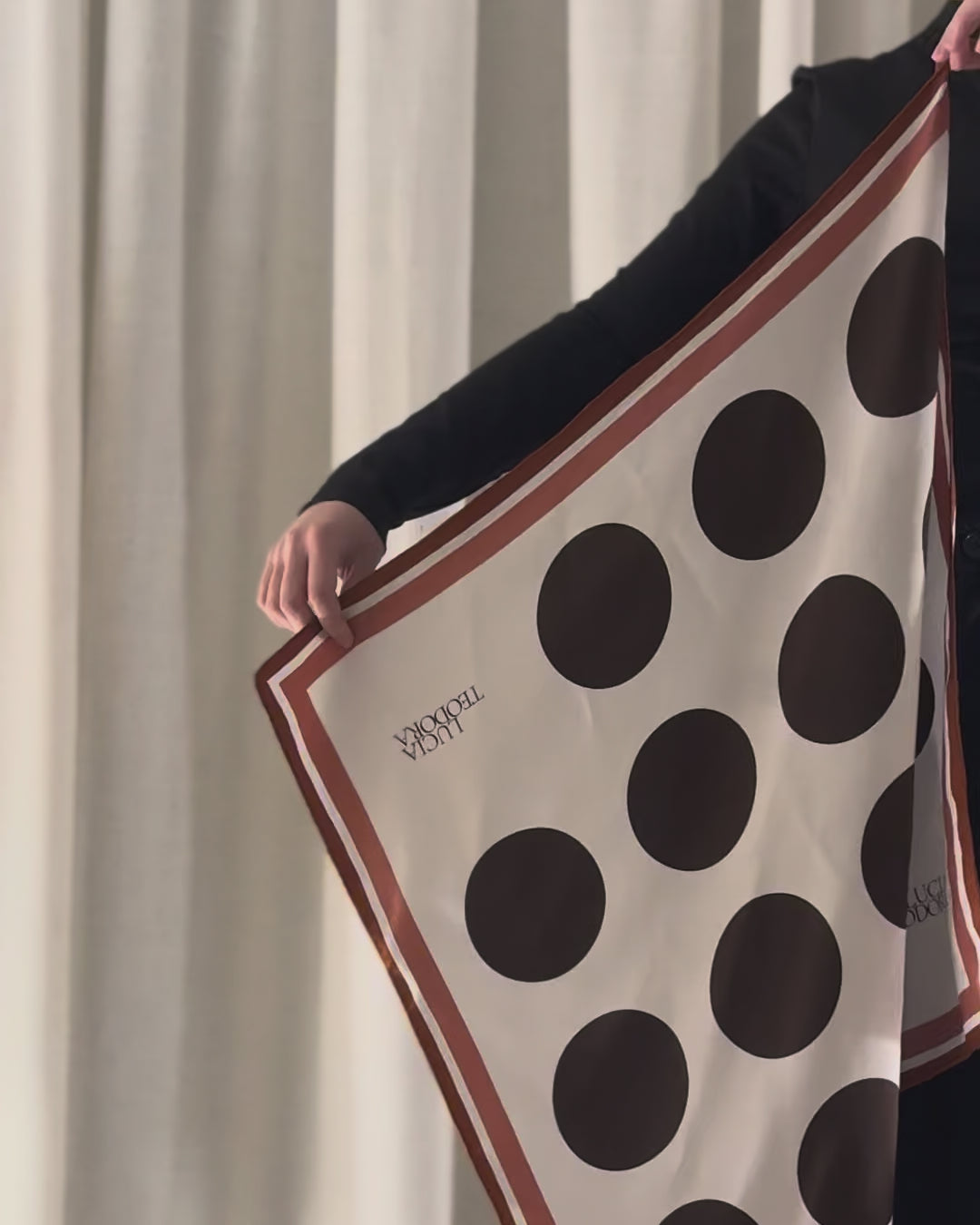 Pañuelo de seda confeccionado artesanalmente con un refinado diseño de lunares y firma de la casa. Su paleta de tonos crea una composición elegante y versátil.